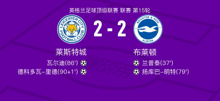 莱斯特城胜布莱顿,瓦尔迪全场最佳,伊戈尔-胡利奥表现惨淡